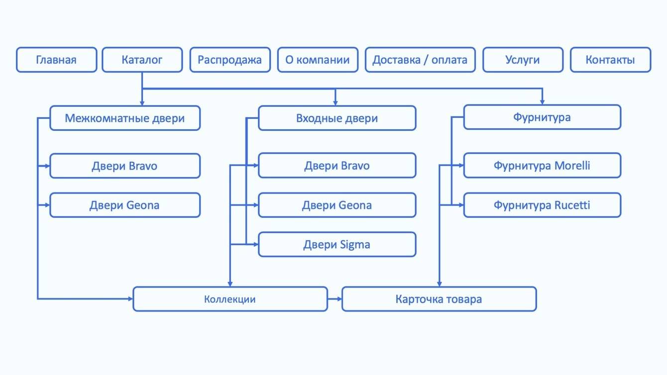 Иерархическая структура сайта салона дверей с разделами каталога и страницами товаров