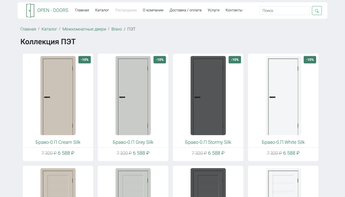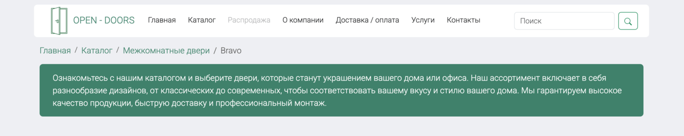 Отображение хлебных крошек на странице товара Bravo в каталоге дверей