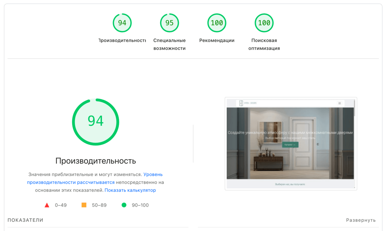 Результат скорости загрузки сайта салона дверей в Google PageSpeed Insights
