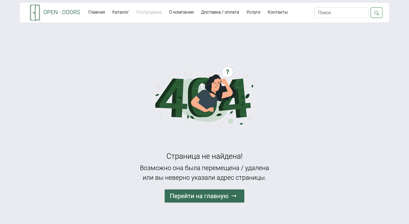 Кастомная страница 404 с навигацией и ссылками на разделы сайта салона дверей