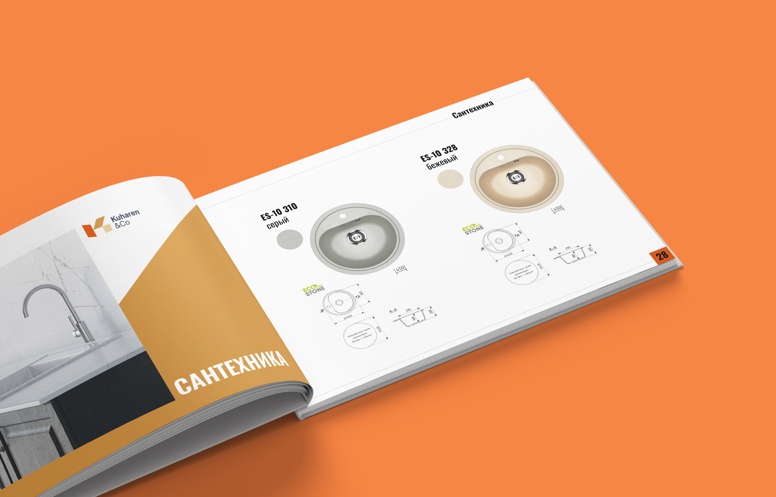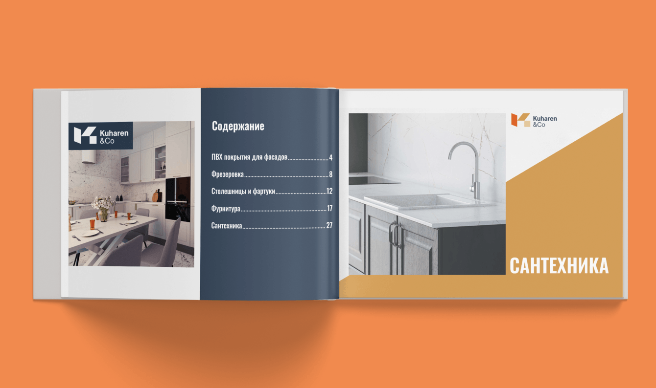 Разработать дизайн каталога для мебельной фабрики Kuharen&Co с учётом фирменного стиля компании. Каталог должен быть удобным и простым для восприятия, чтобы клиенты могли легко разобраться в ассортименте.