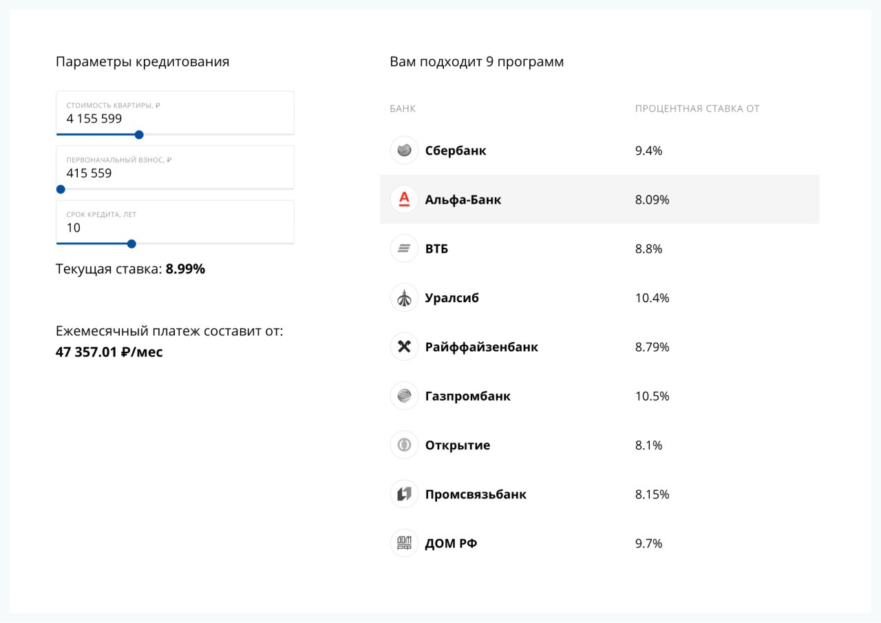 При переходе на страницу ипотеки пользователь может быстро рассчитать ежемесячный платёж. Представлены все банки, с которыми сотрудничает «АСК». У каждого банка актуальная процентная ставка (минимальная). При выборе конкретного банка калькулятор показывает релевантный первоначальный взнос (минимальный) и рассчитывает платежи с учётом текущей ставки.