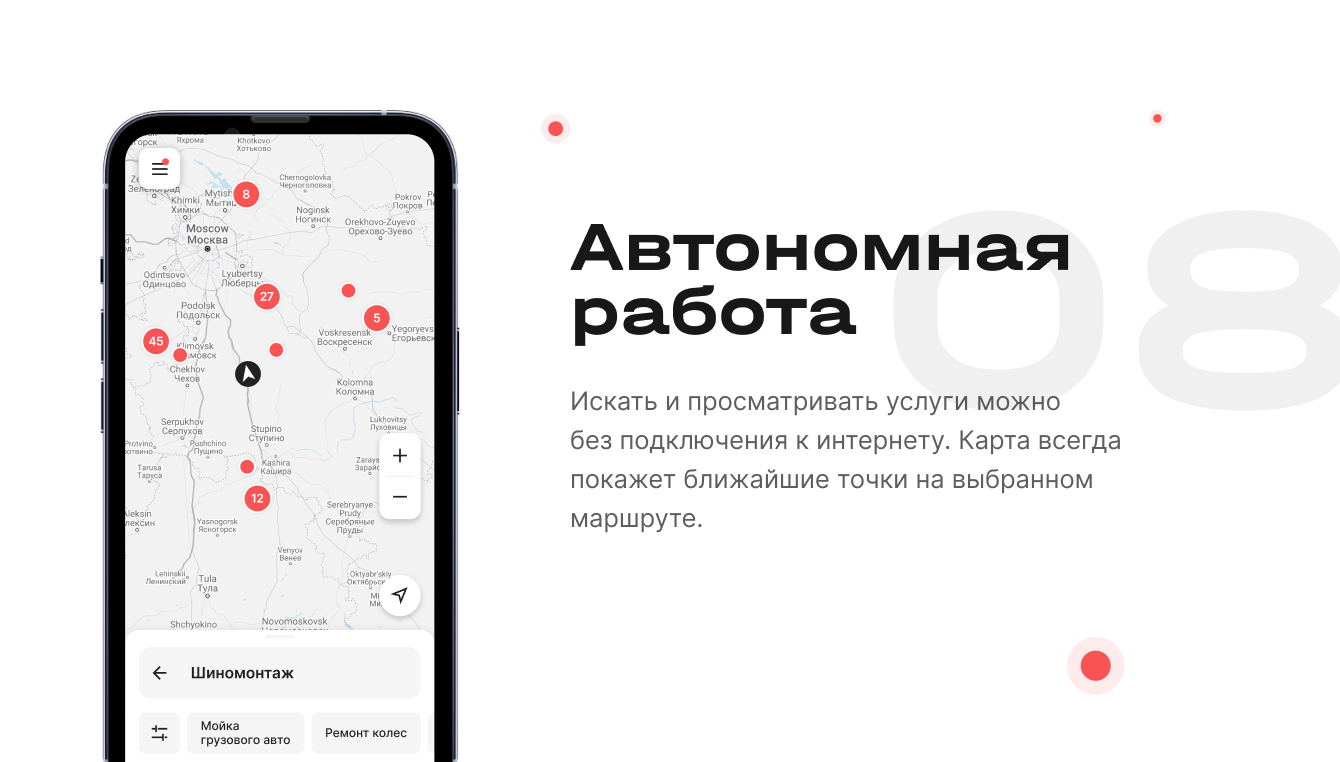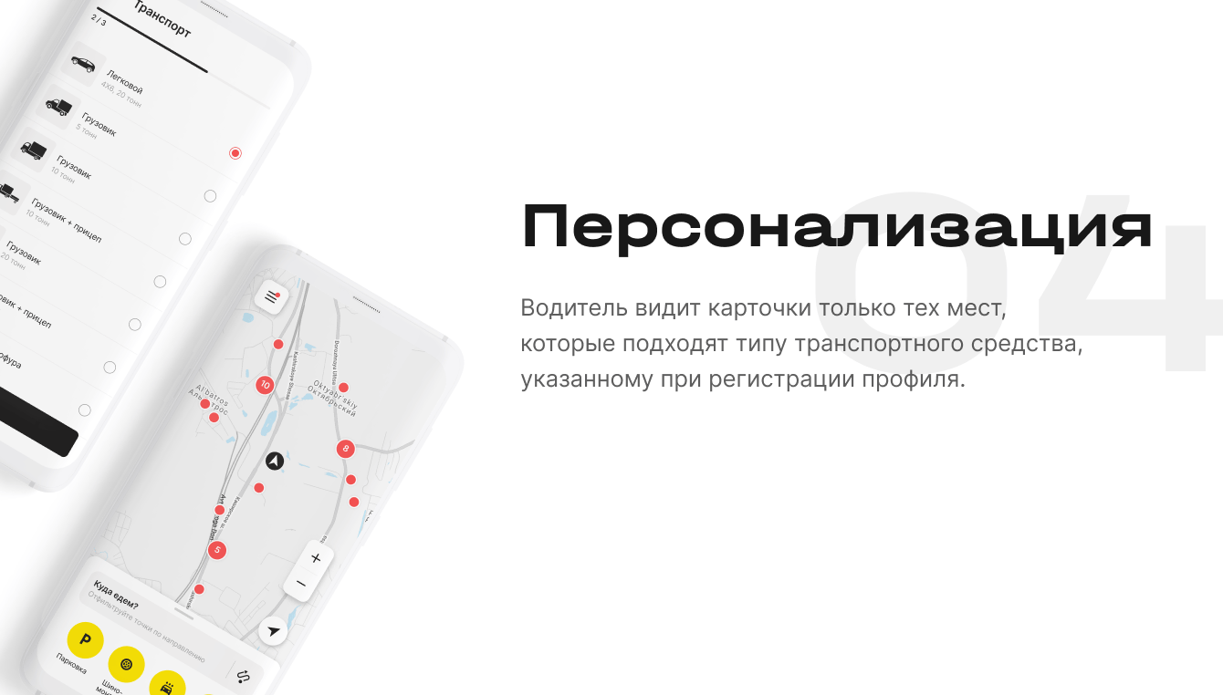 Главной особенностью приложения стала персонализация. Водитель указывает тип своего автомобиля, размерность шин и т.д. — тогда на карте отображаются только подходящие ему места. К примеру, для тягача 40 тонн будут показаны только те локации, где его смогут обслужить.