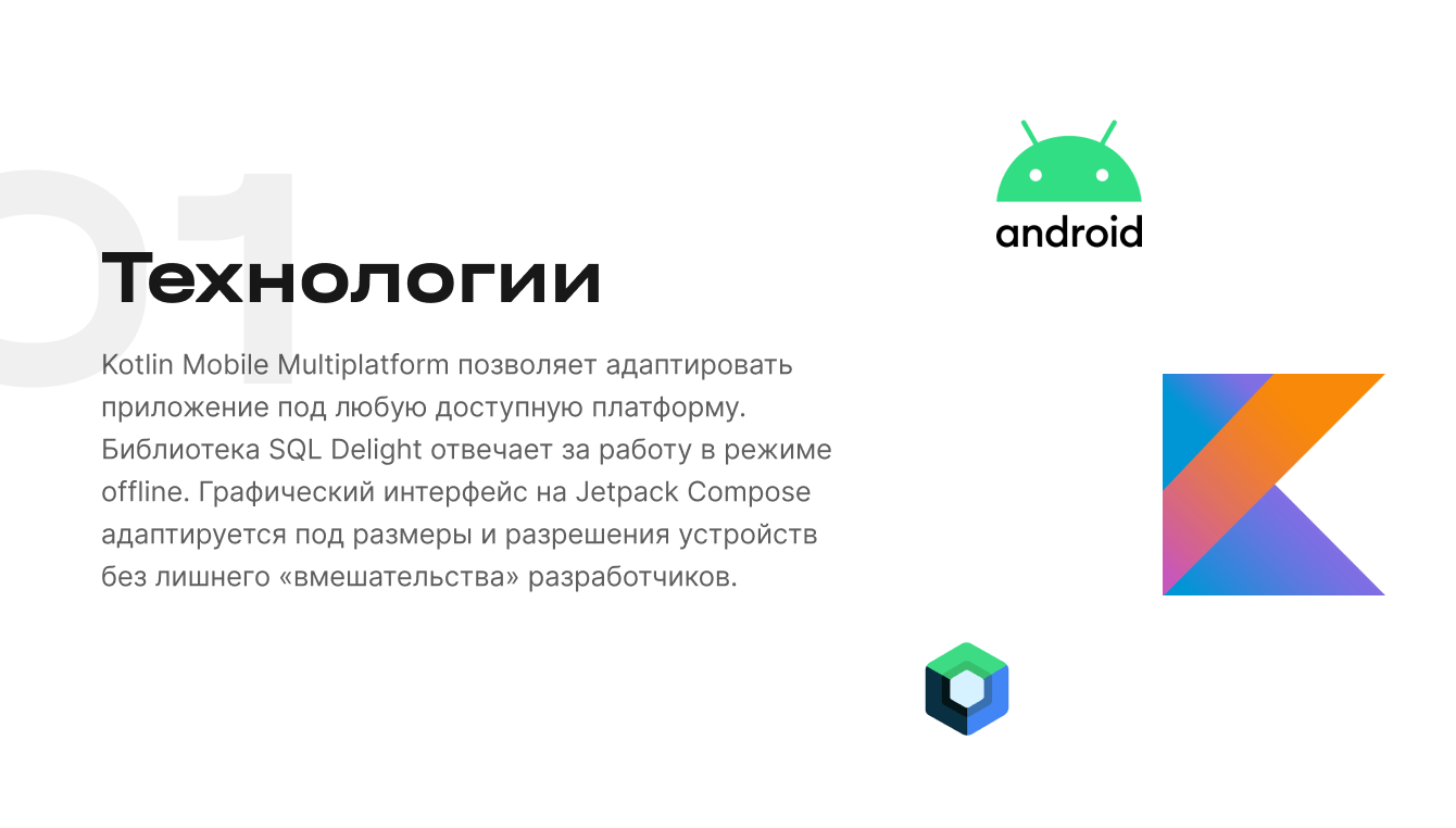 Для разработки выбрали Kotlin Mobile Multiplatform и библиотеку SQL Delight, чтобы приложение без проблем адаптировалось под iOS и работало в офлайн-режиме. А Jetpack Compose позволяет адаптировать интерфейс под нужные разрешения устройств минимальными усилиями со стороны разработчиков.