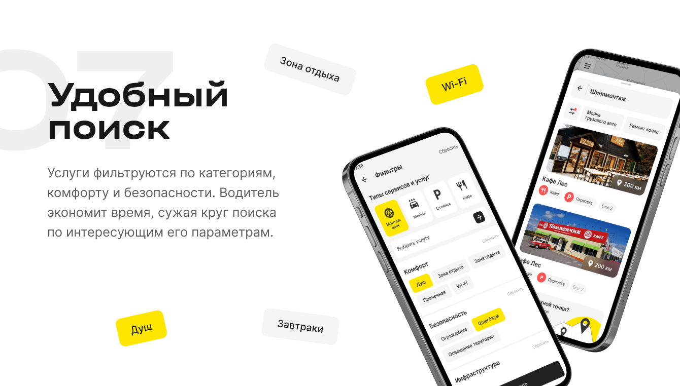 Водители заранее изучают и бронируют услуги организаций. В карточке каждого заведения представлен список услуг, цены и контакты, а услуги можно отфильтровать: например, если интересует мойка машины или наличие зоны отдыха.