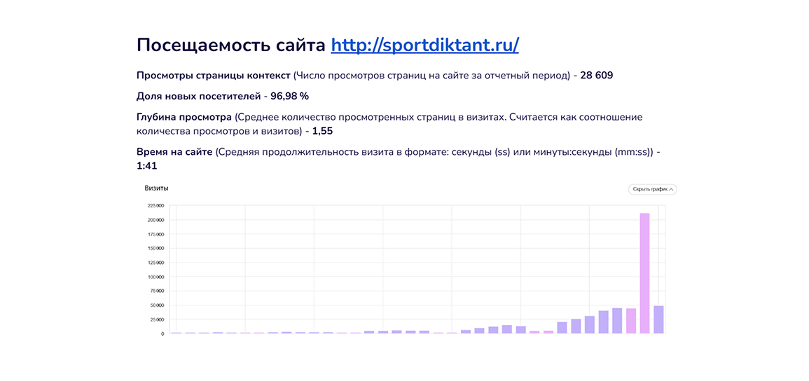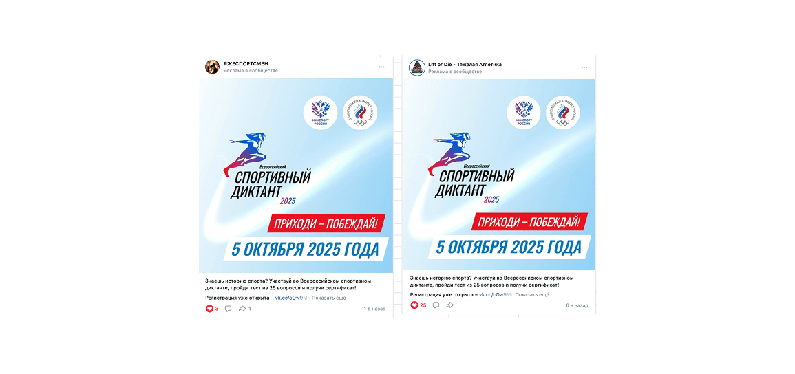 «Спортивный диктант» — это всероссийская акция Олимпийского комитета России о спорте и здоровом образе жизни, в которой участники проходят онлайн-тест и получают сертификат. Проект работает по всей России, акцент на массовую B2C-аудиторию: школьники, студенты, молодые родители, любители спорта.