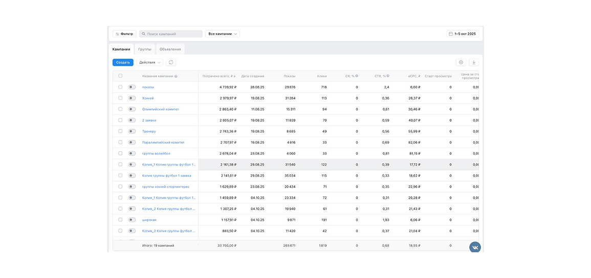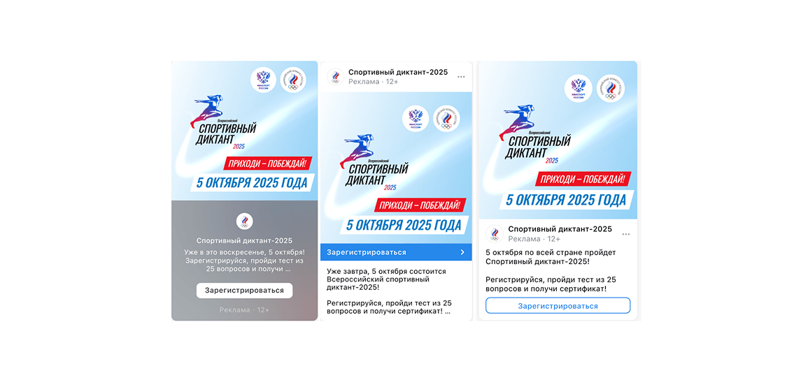 Запустили таргетированную рекламу VK с переходом на сайт для мужчин и женщин 25-50 лет по 16 крупным городам России с интересами «спортивный интерес» и подпиской на спортивные сообщества, включая сообщества Олимпийского комитета и Минспорта. За счет точных интересов и ярких креативов мы получили высокий CTR и приемлемую стоимость клика.