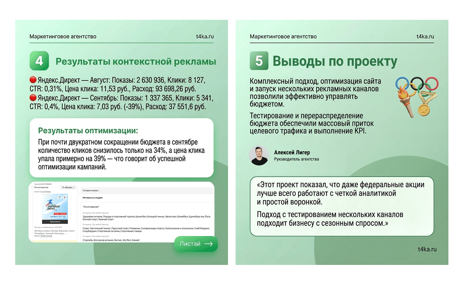 «Главная сложность проекта — короткое окно на привлечение участников и очень широкая география при фиксированном бюджете. Мы решили задачу за счет четкого планирования по неделям, сегментации аудиторий по интересам к спорту и постоянной оптимизации ставок и креативов в Яндекс.Директ, VK и Telegram.»