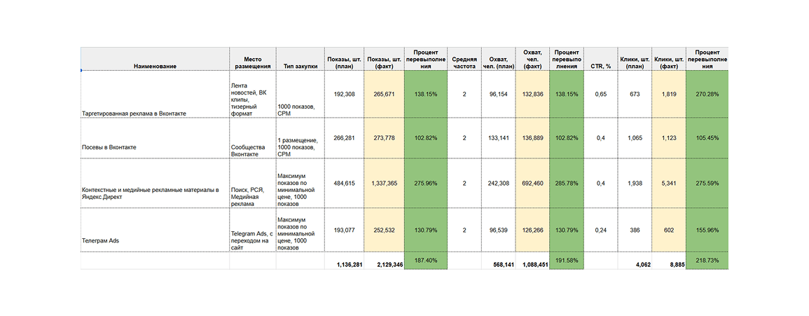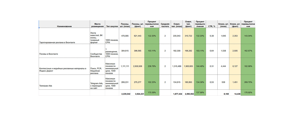 Для Яндекс.Директ отдельно отслеживали работу разных типов кампаний: поиск, РСЯ, медийка и ретаргетинг, а для VK и Telegram проверяли эффективность связок «интересы + креатив». Такой подход позволил не «настраивать рекламу вслепую», а опираться на цифры и быстро усиливать самые сильные каналы.
