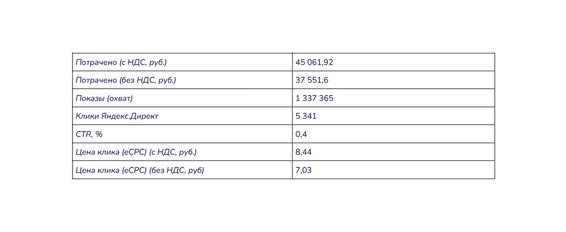 Фактически в августе: потрачено 58 586,4 руб. с НДС, получено 2 505 кликов по средней цене 19,48 руб. за переход