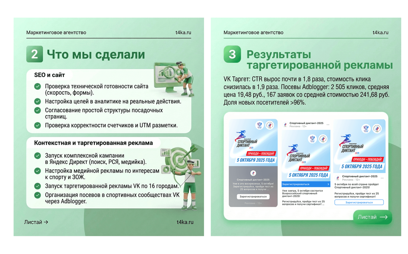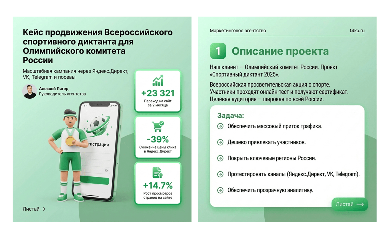 Олимпийский комитет России обратился к нам с задачей продвижения всероссийской просветительской акции «Спортивный диктант 2025» — быстро собрать участников по всей России и раскачать новый сайт проекта. За два месяца мы запустили комплексную рекламу в Яндекс.Директ, VK, Telegram и через посевы, привели более 23 000 переходов на сайт и отработали рекламный бюджет 555 000 руб.