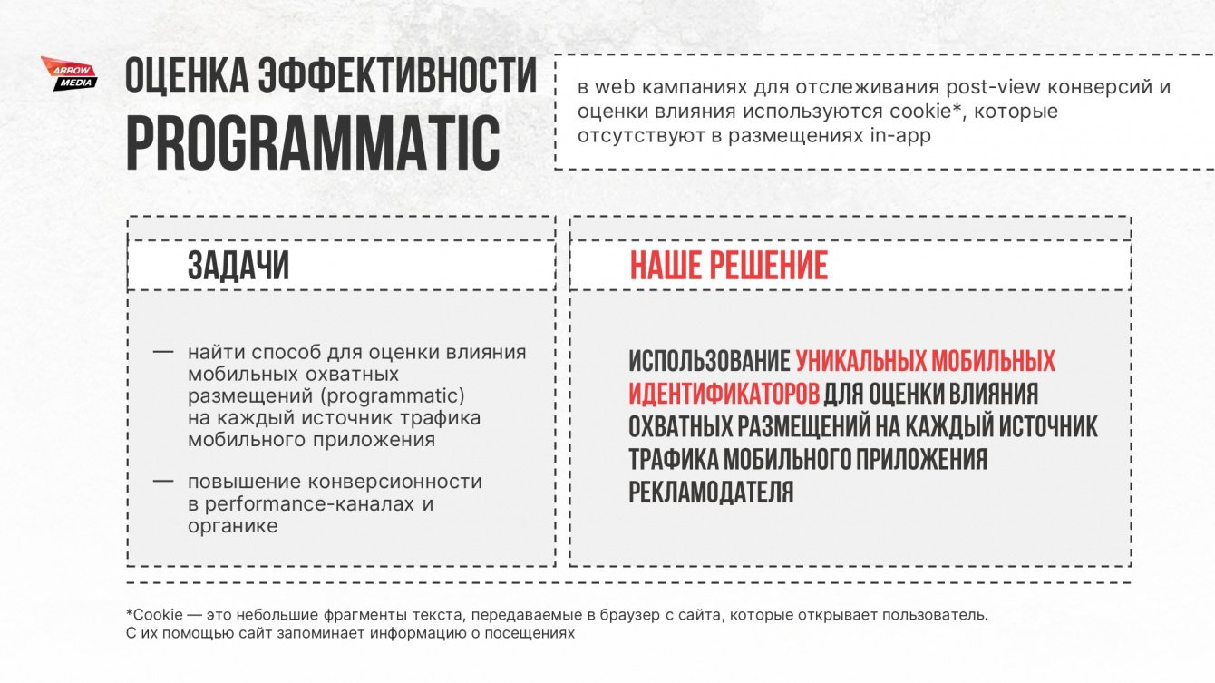 - найти способ для оценки влияния мобильных охватных размещений (programmatic) на каждый источник трафика мобильного приложения;