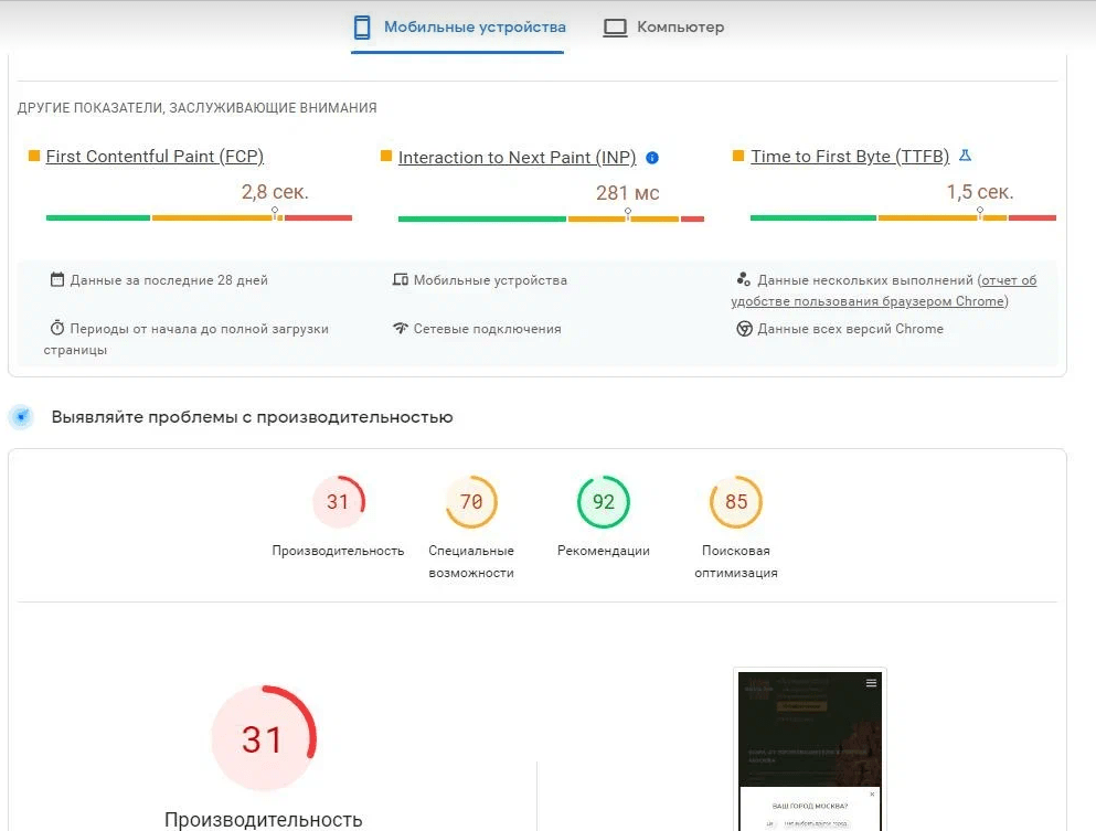 Оценка скорости загрузки показала наличие существенных проблем в этой области: