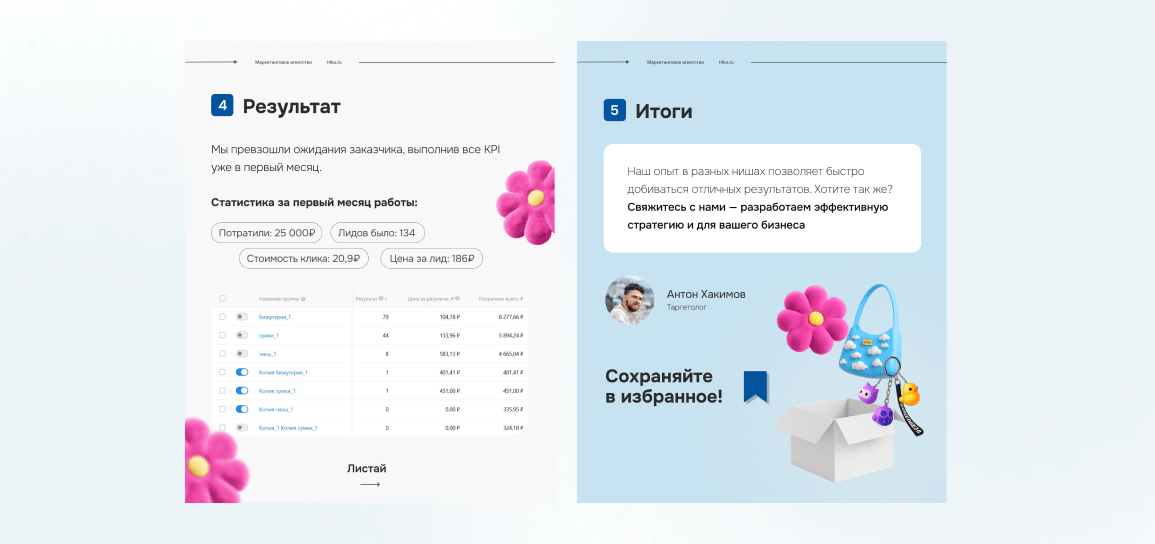 «Этот кейс наглядно демонстрирует, как грамотно спланированная и реализованная рекламная кампания может обеспечить значительный рост числа лидов при оптимальном использовании бюджета. Мы уверены, что наш опыт и профессионализм помогут вам достичь подобных результатов. Свяжитесь с нами сегодня, чтобы обсудить ваши маркетинговые цели и разработать эффективную стратегию для вашего бизнеса»