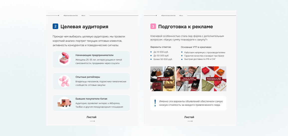 Клиент обратился к нам с задачей наладить стабильный поток целевых лидов из соцсетей с помощью таргетированной рекламы. Фокус — привлекать именно оптовых покупателей, снизить стоимость лида и отсечь «любопытных», не готовых к закупке.