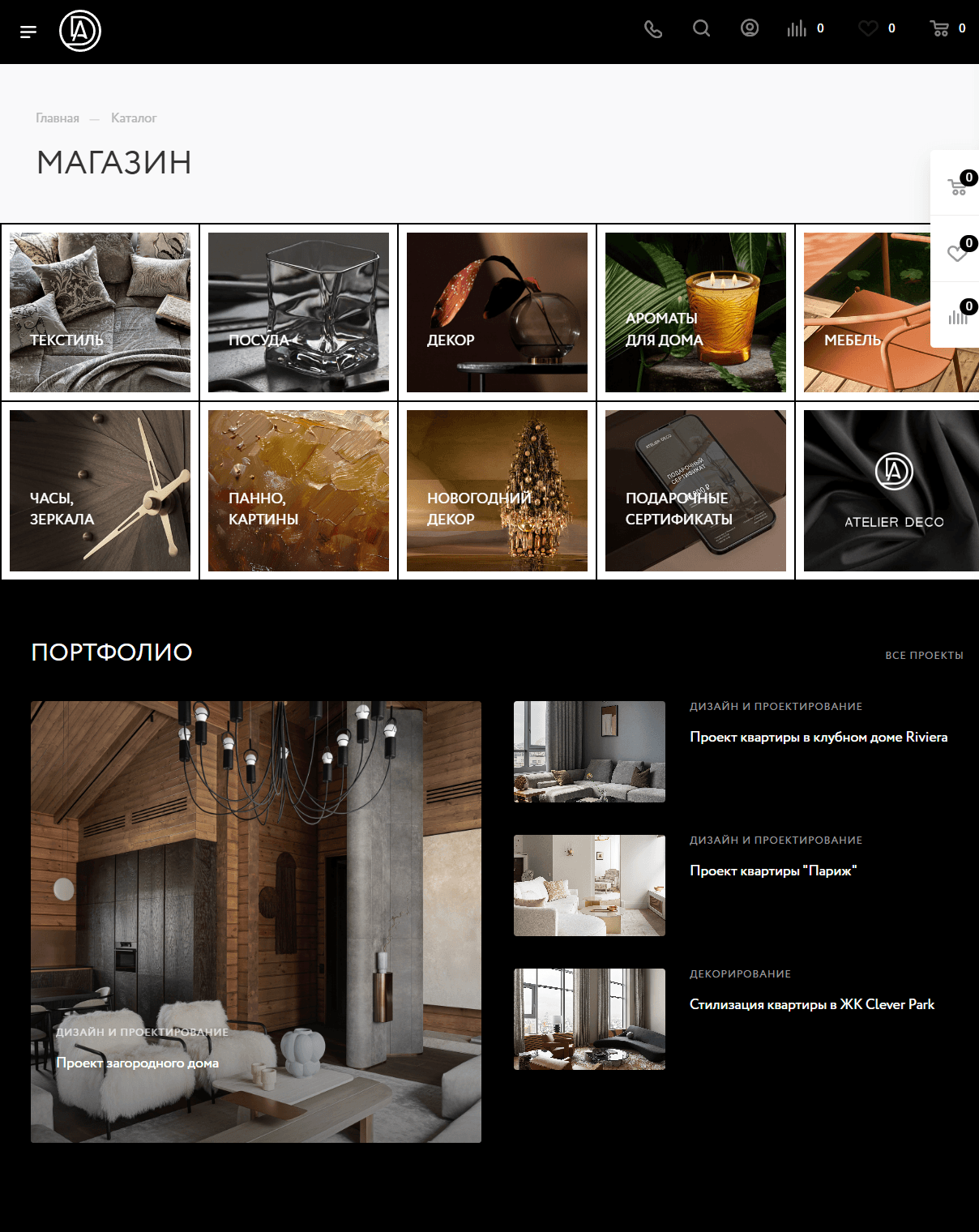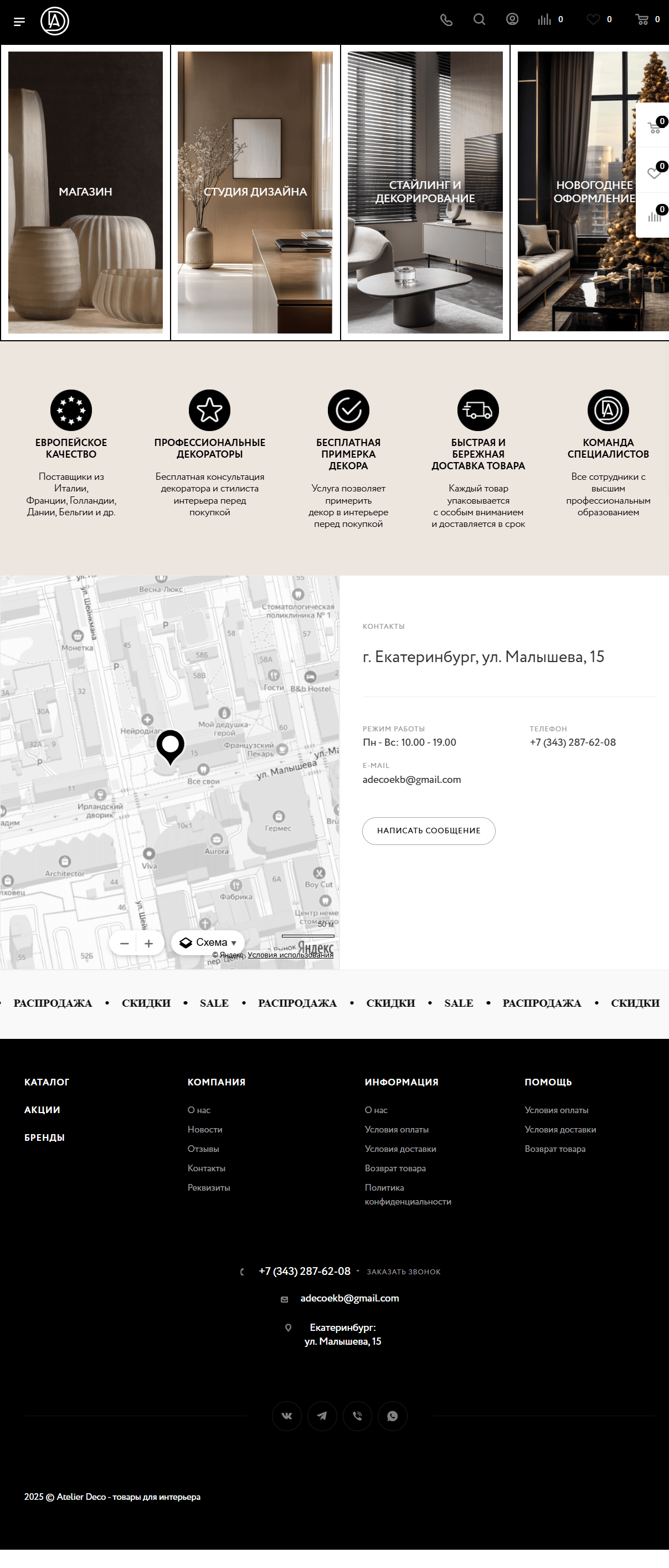 «Ателье Деко» — имиджевый интернет-магазин премиального текстиля, посуды, мебели и декора для салона Atelier Deco.