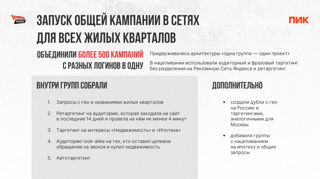 В ходе работы объединили более 500 компаний в одну, выстроив архитектуру «одна группа - один проект». В нацеливании использовали аудиторный и фразовый таргетинг без разделения на Рекламную сеть Яндекса и ретаргетинг. В процессе реализации стратегии внутри групп были собраны запросы с гео и названиями жилых кварталов, таргетинг на интересы «Недвижимость» и «Ипотека», аудиторию look-alike, оставивших целевое обращение на звонок и купил недвижимость, а также автотаргетинг.