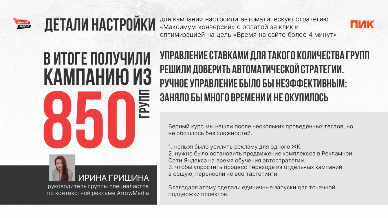 В итоге получили кампанию из 850 групп. Управление ставками для такого количества групп решили доверить автоматической стратегии, так при ручной механике проект просто не окупился бы.
