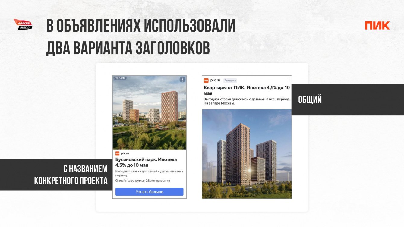 ПИК — технологическая компания, которая строит жильё и социальную инфраструктуру. Для максимального охвата потенциальных клиентов используются в том числе все инструменты Рекламной Сети Яндекса.