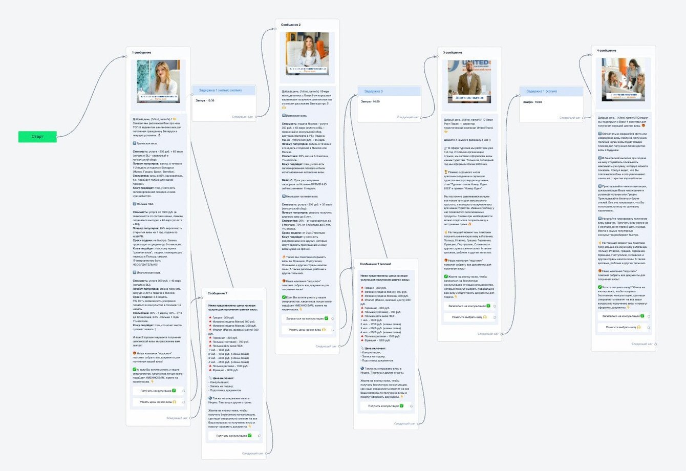 – Мы разработали лид-магнит (подарок) для привлечения в чат-бота – гайд "ТОП-5 способов получения шенгенской визы" и создали воронку из 4 сообщений для прогрева пользователей к оставлению заявку.