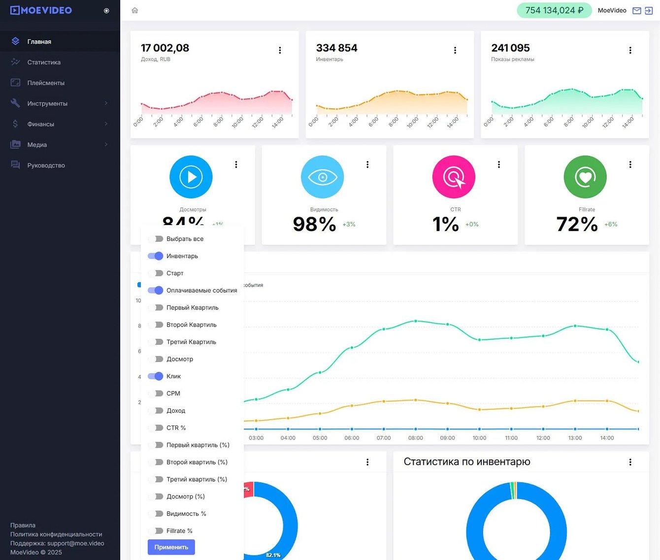 Главный инсайт — не стоит бояться экспериментировать и отдавать сильные позиции только РСЯ. Эксперимент показал, что прямое размещение плеера MoeVideo работает для нас заметно выгоднее, чем установка их плеера по порогу CPM через Adfox.