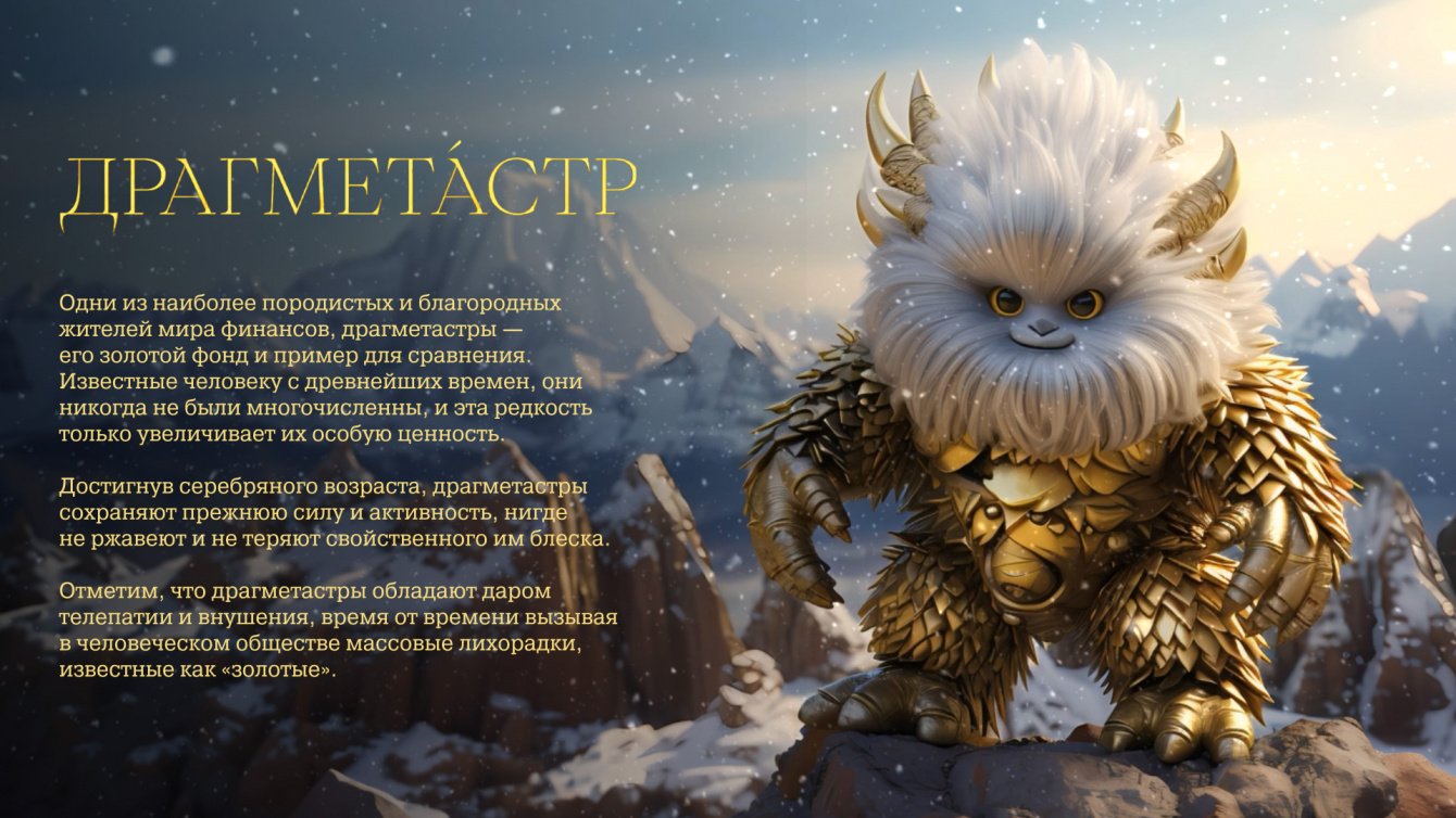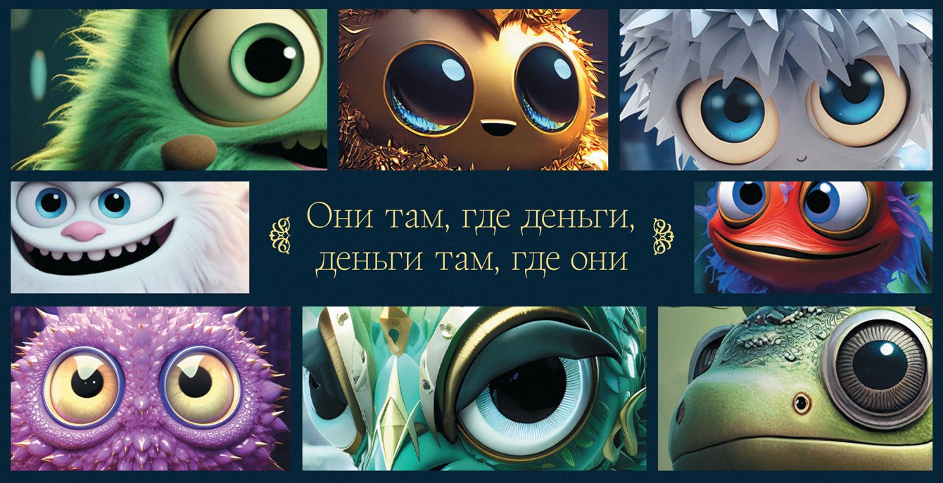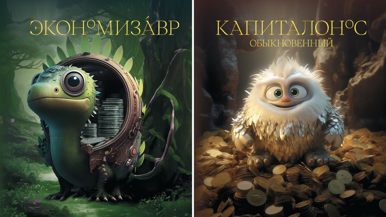 Для создания существ мы прибегли к помощи генеративной графики. Наши дизайнеры создавали их с помощью ИИ, а затем дорабатывали лучшие варианты. Копирайтер дал героям забавные говорящие имена, имеющие явное отношение к финансово-денежной сфере — например, Валютелла, Сберебобль, Монетра. Картину придуманной нами вселенной дополнили псевдонаучные описания персонажей.