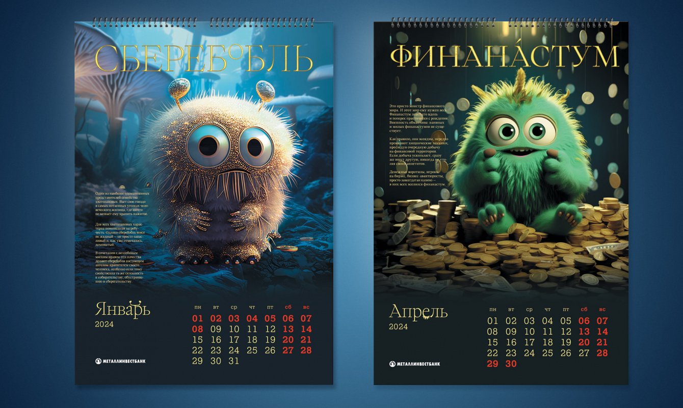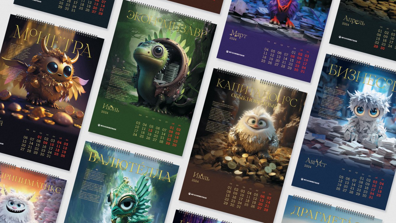 В прошлом году мы разработали календарь для «Металлинвестбанка». В нем мы создали целый мир — мир финансов, населенный фантастическими существами. Каждый обитатель мира связан с деньгами, хоть и относится к ним по-своему. Проще говоря — они там, где деньги, а деньги там, где они.