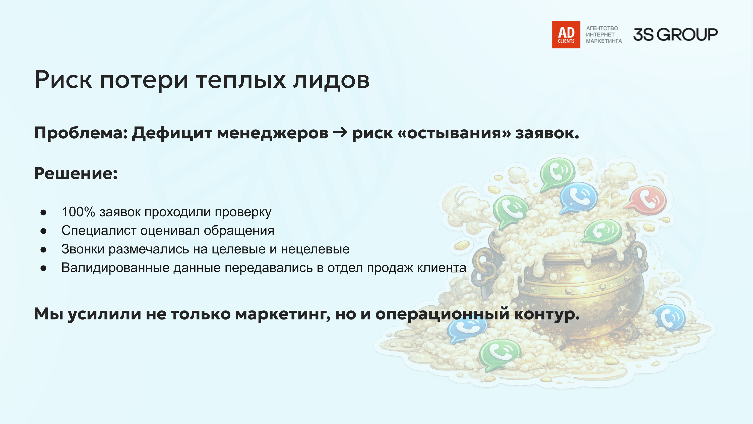 Внедрили систему активного мониторинга обращений и выстроили постоянную коммуникацию с отделом продаж. Команда агентства оперативно передавала сигналы о каждой новой заявке, фактически выступая дополнительным звеном контроля качества обработки.