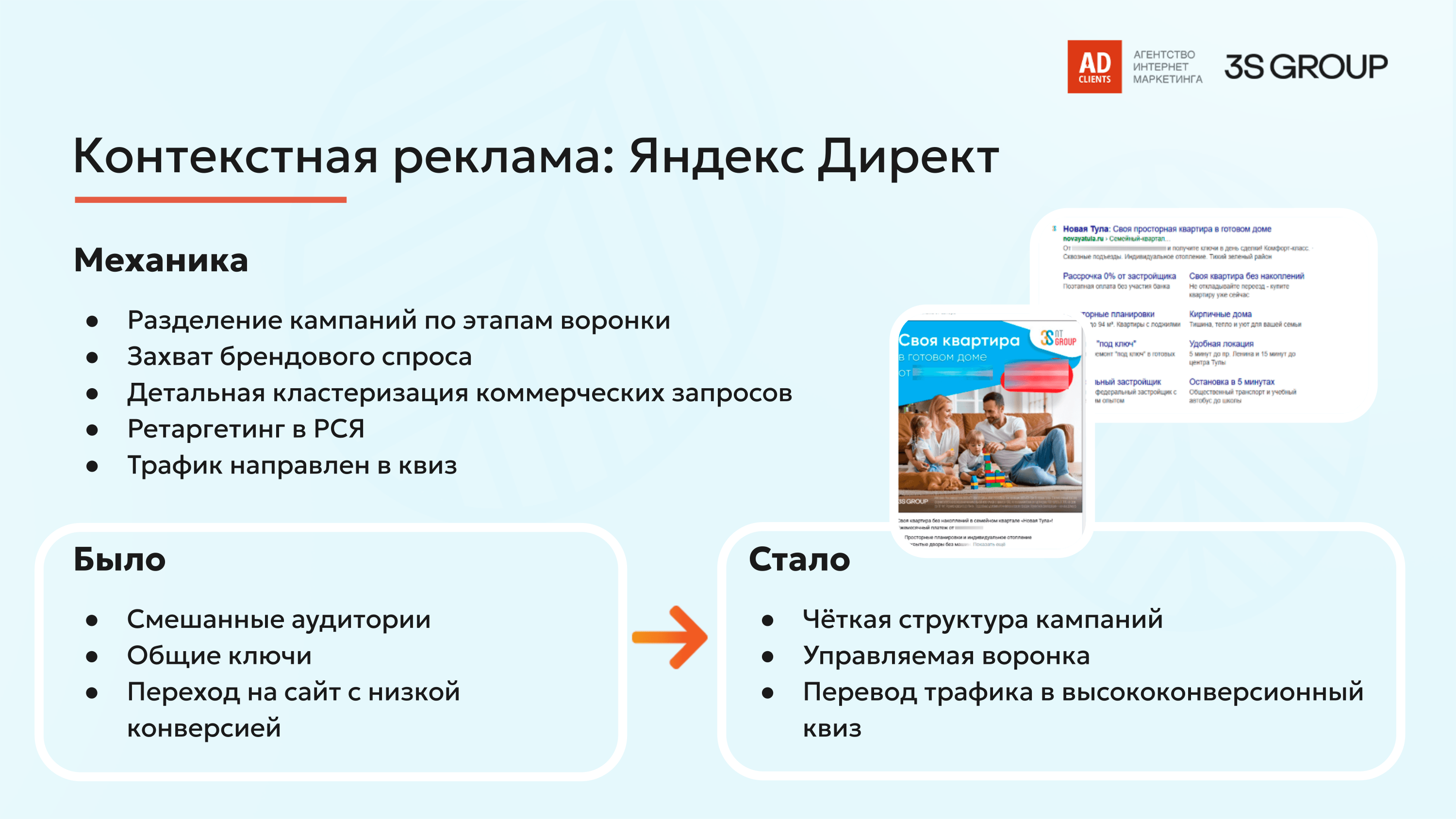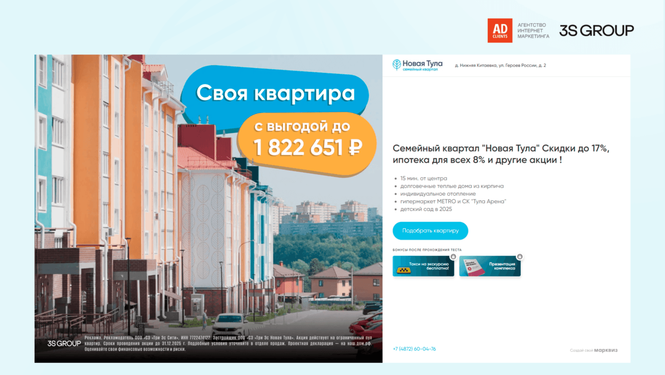 — Кампания «Коммерция + Инфо»: Перехват пользователей в стадии активного поиска. Использовали детальную семантику по кластерам: «новостройки в привокзальном районе», «купить квартиру в Туле», «ипотека на новостройку», «планировки 2-комнатных квартир».