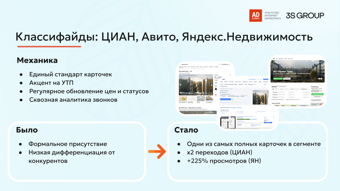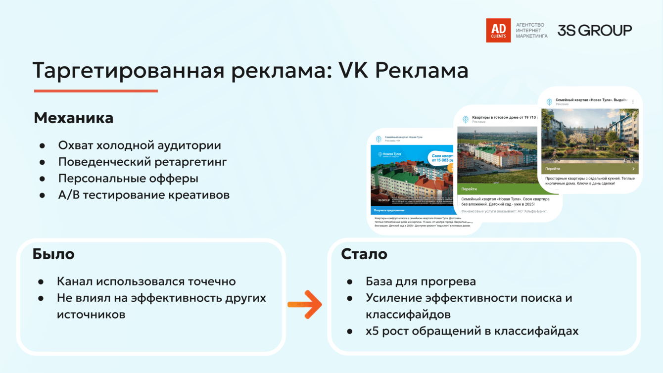 VK стал ключевым каналом для охвата и первичного прогрева, создавая фундамент доверия. Пользователи, пришедшие из VK, затем охотнее оставляли заявки в других каналах (поиск, классифайды). Например, в классифайдах это позволило увеличить число целевых обращений в 5 раз.
