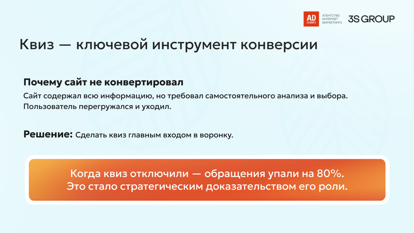 Когда квиз временно отключили — обращения упали на 80%.