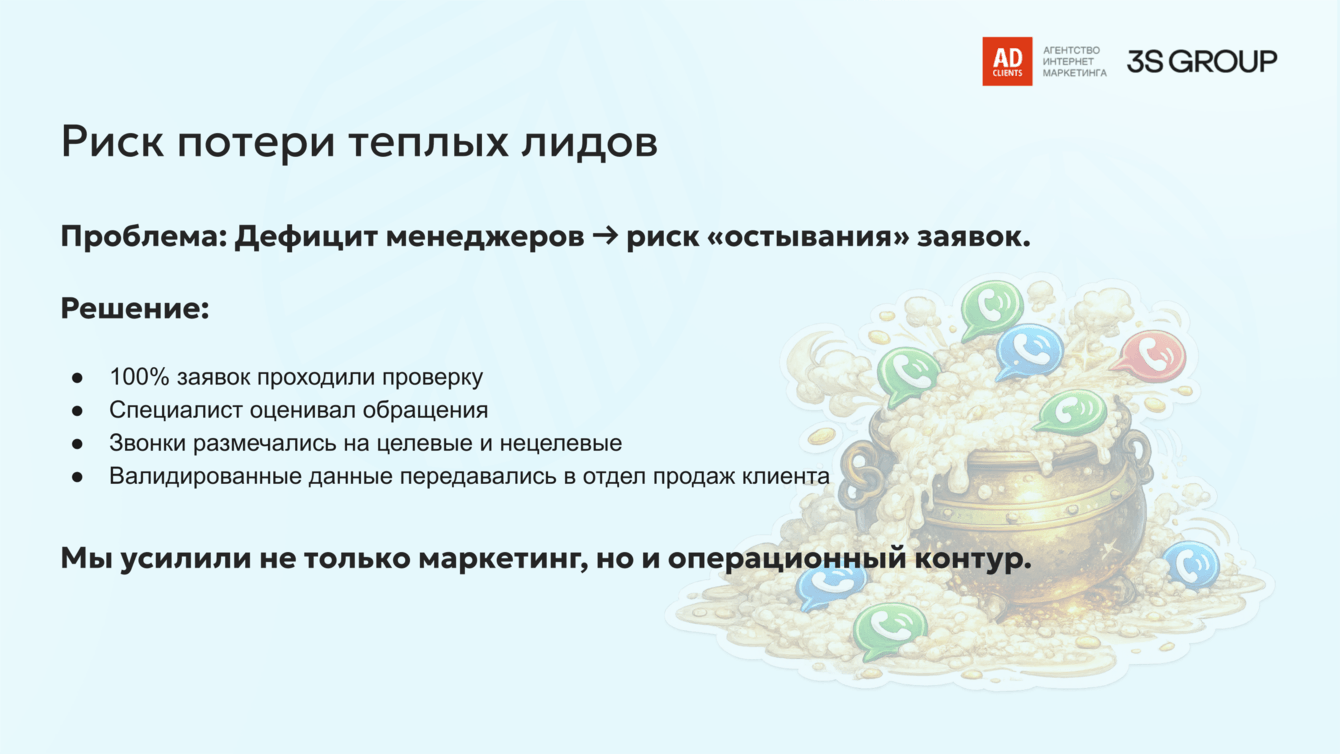В период запуска рекламы у клиента был дефицит персонала в отделе продаж. Это создавало риск потери дорогостоящих лидов, которые могли «остывать» без оперативного контакта — особенно в высококонкурентной нише недвижимости.