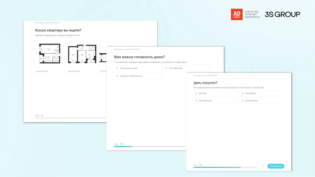 — Для ретаргетинга: сегментация аудитории по степени вовлеченности (посетители сайта, смотревшие видео, запускавшие квиз). Для каждой группы — свое УТП в креативах (акция, подборка планировок, преимущество ипотеки).