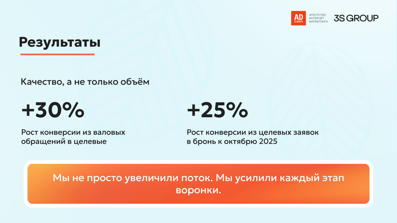 Принятые решения позволили не просто стабилизировать поток заявок, но и минимизировать потери на каждом этапе воронки — от привлечения до первичного контакта, что в конечном счете положительно сказалось на итоговой конверсии в продажи.