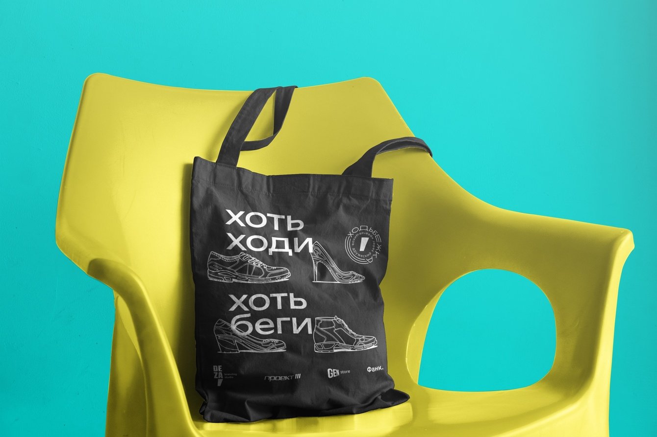 В основе фирменного стиля — иллюстрации повседневной обуви. С помощью дополнительных деталей и ярких цветов туфли и ботинки превращаются в беговую экипировку. Это отражает дуализм идеи и словно говорит, что бегун есть в каждом из нас — стоит только в это поверить.