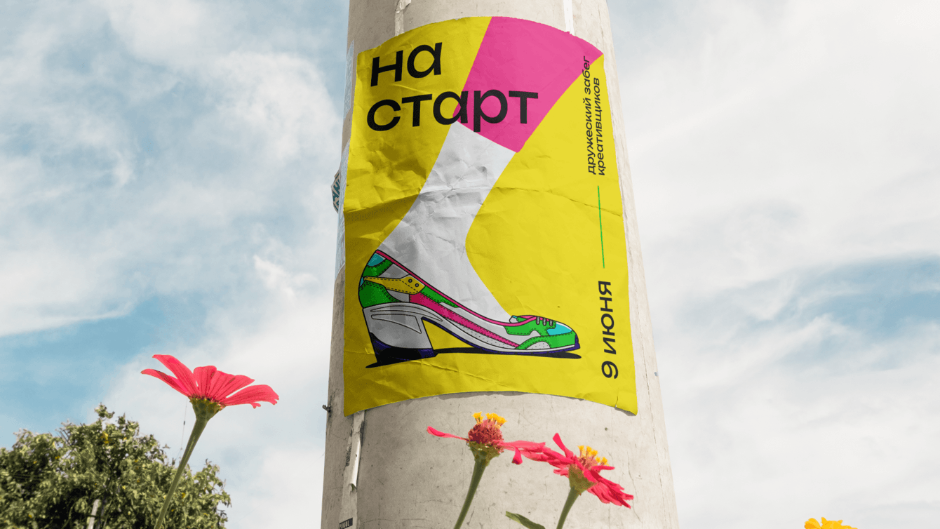 Отдельные элементы кроссовок, красочные и пластичные, работают и без привязки к обуви. Они становятся автономными элементами айдентики и отсылают к разнообразию креативных профессий, представители которых и выходят на старт забега.
