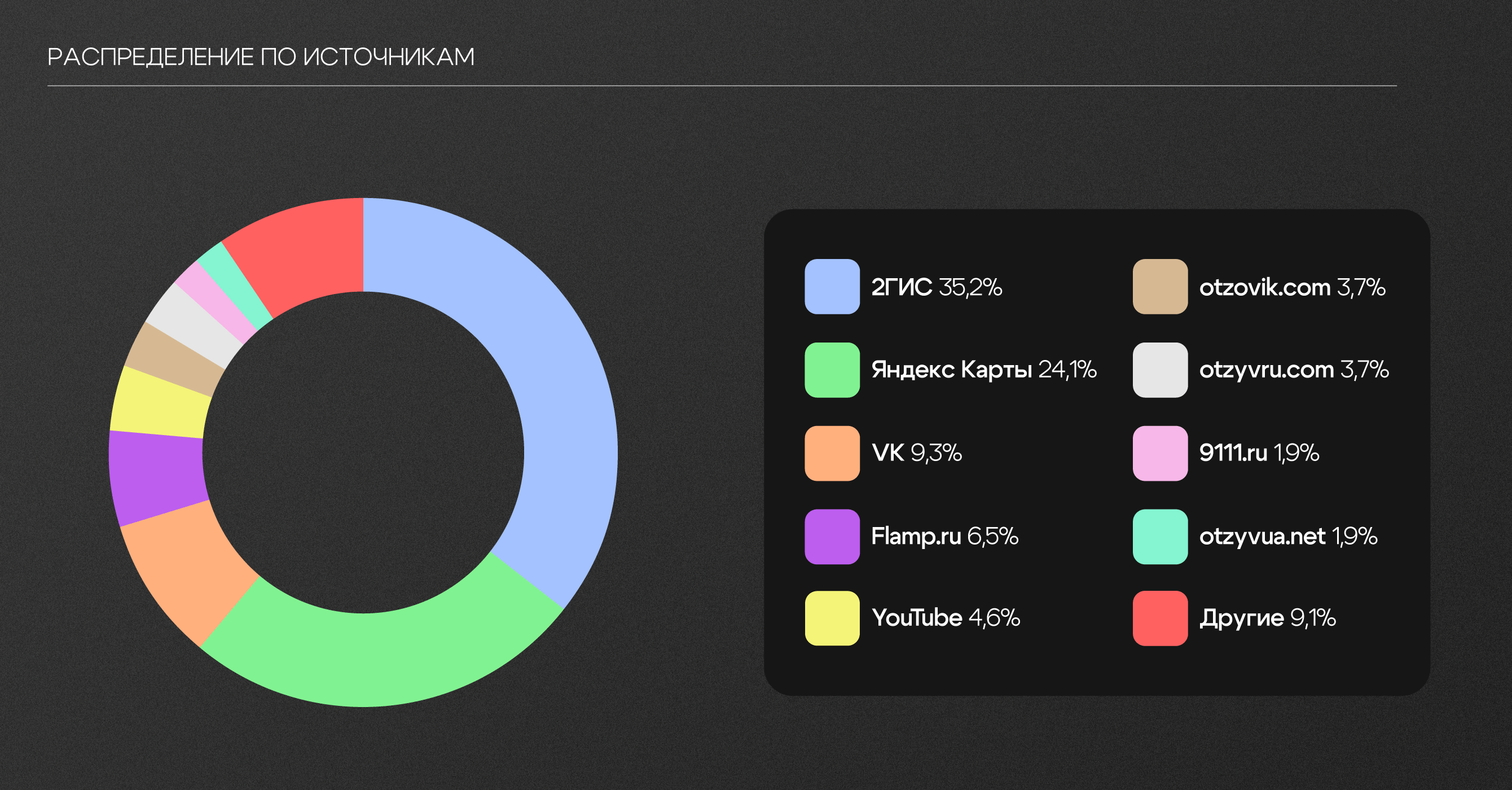 На первом месте среди источников оказался 2ГИС — отзывы на филиалы в разных городах появлялись каждый день, что делало невозможным отслеживание информации вручную. Такая высокая активность связана с интересом к бренду и с особенностью площадки: первичная модерация 2ГИС простая, отзывы появляются в профиле компании сразу. В то время как модерация отзыва на Отзовике может проходить от трех дней до двух недель, а на Яндекс Картах — до недели.