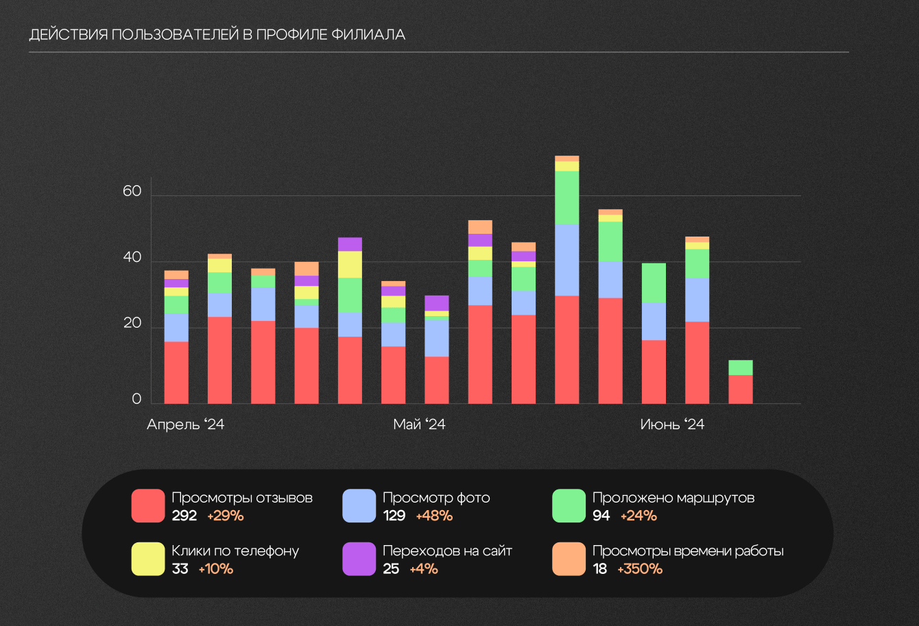 6. Благодаря активности бренда и ответам на отзывы выросла видимость карточек в Яндекс Картах и 2ГИС. Выросли показатели конверсии просмотров в звонки и переходы на сайт.