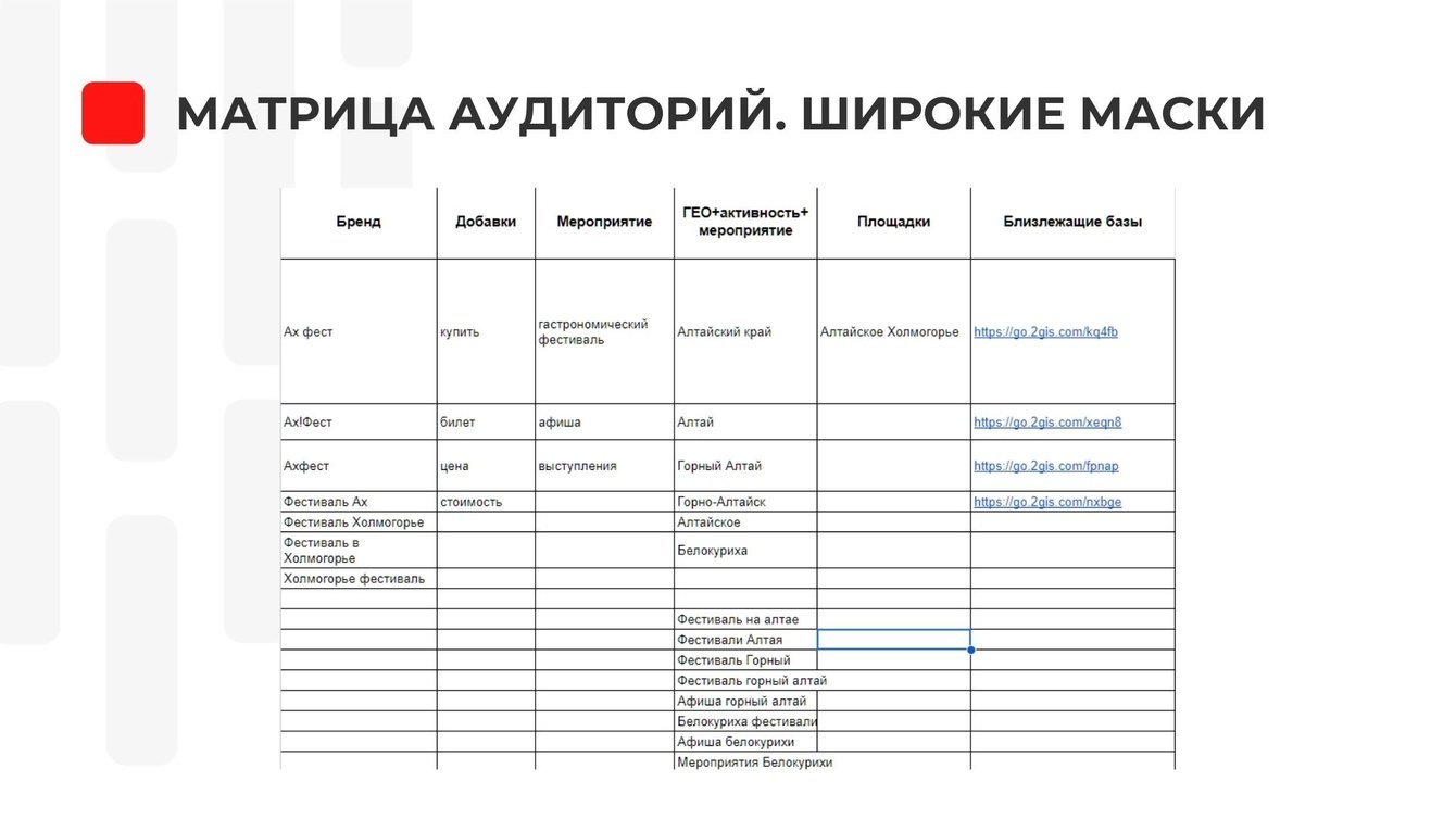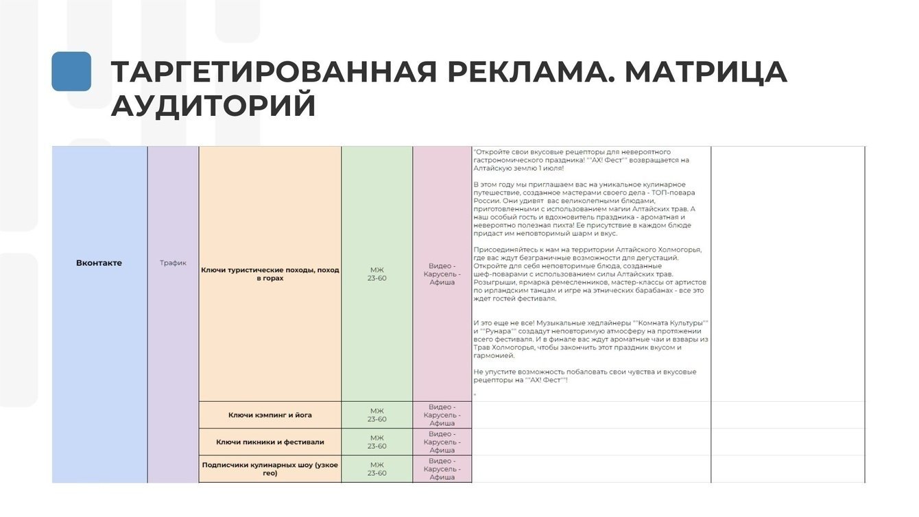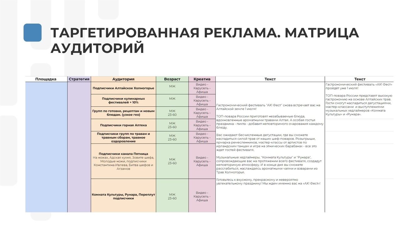 Целевая аудитория - бренд мероприятия и горячая аудитория, ключи по фестивалям и отдыху в горном Алтае.