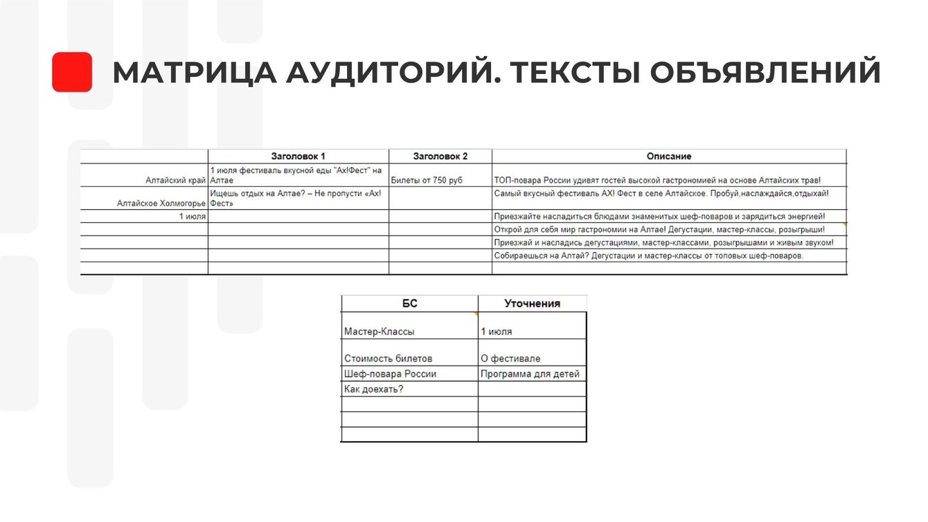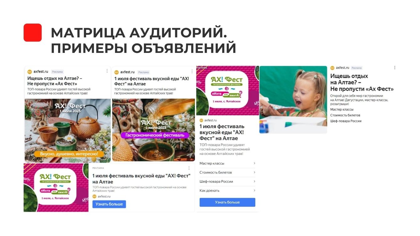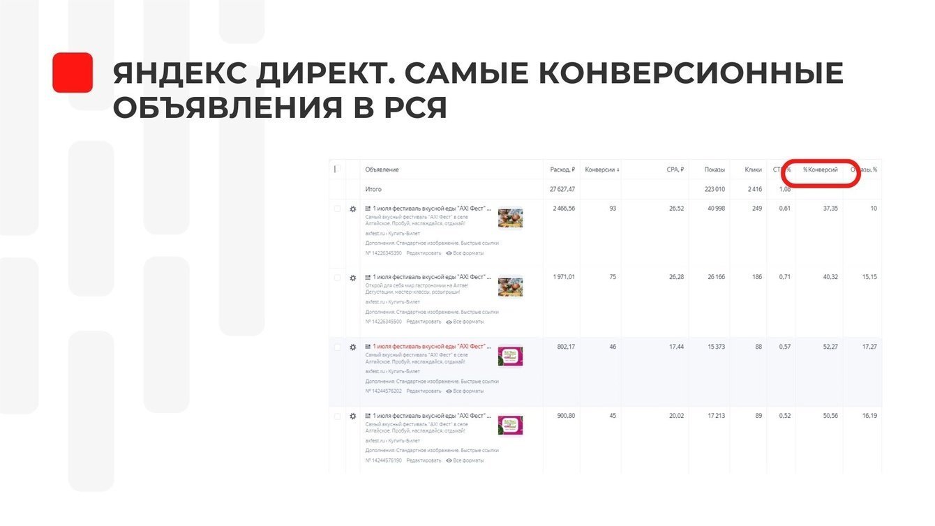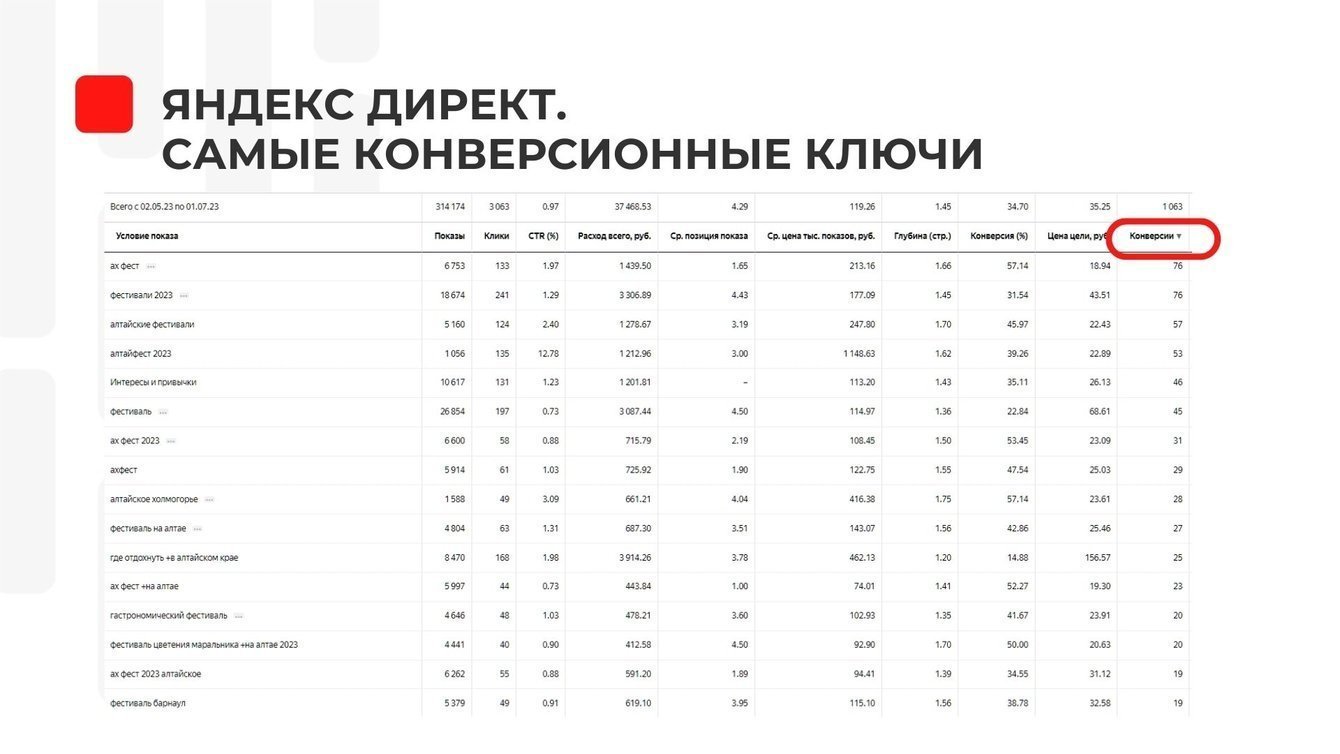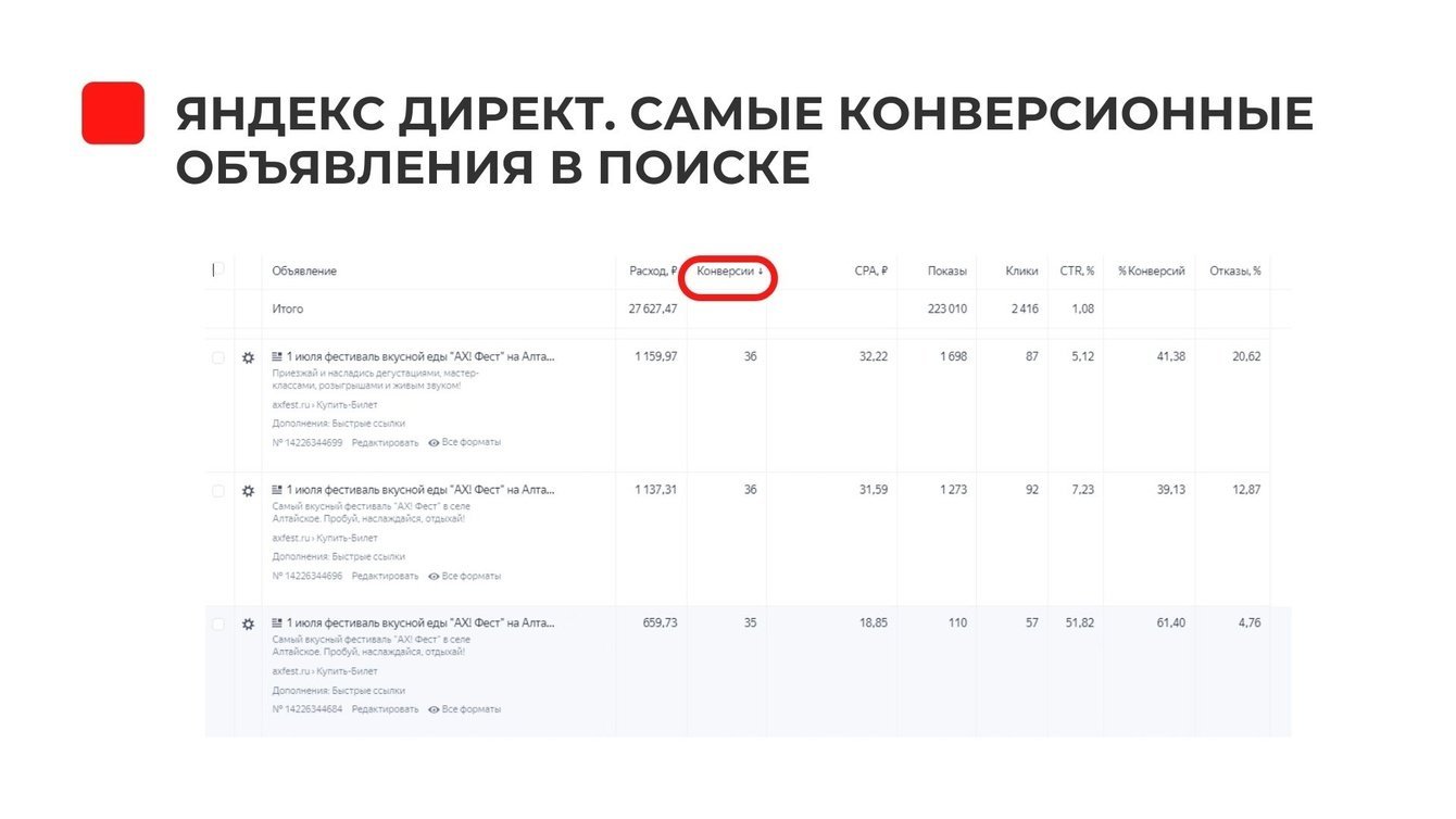 1. В Яндекс. Директ больше всего продаж дали следующие стратегии: Поиск - узкое ГЕО, ключ "ах фест". По РСЯ самым конверсионным был ключ - "семейный отдых на Алтае с детьми летом"