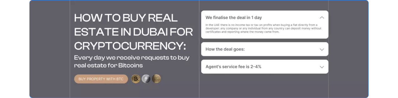 Ниже размещена информация о том, как купить недвижимость за криптовалюту. Про этот актуальный запрос мы рассказали отдельно и подчеркнули безопасность и отсутствие комиссии при расчёте таким способом.