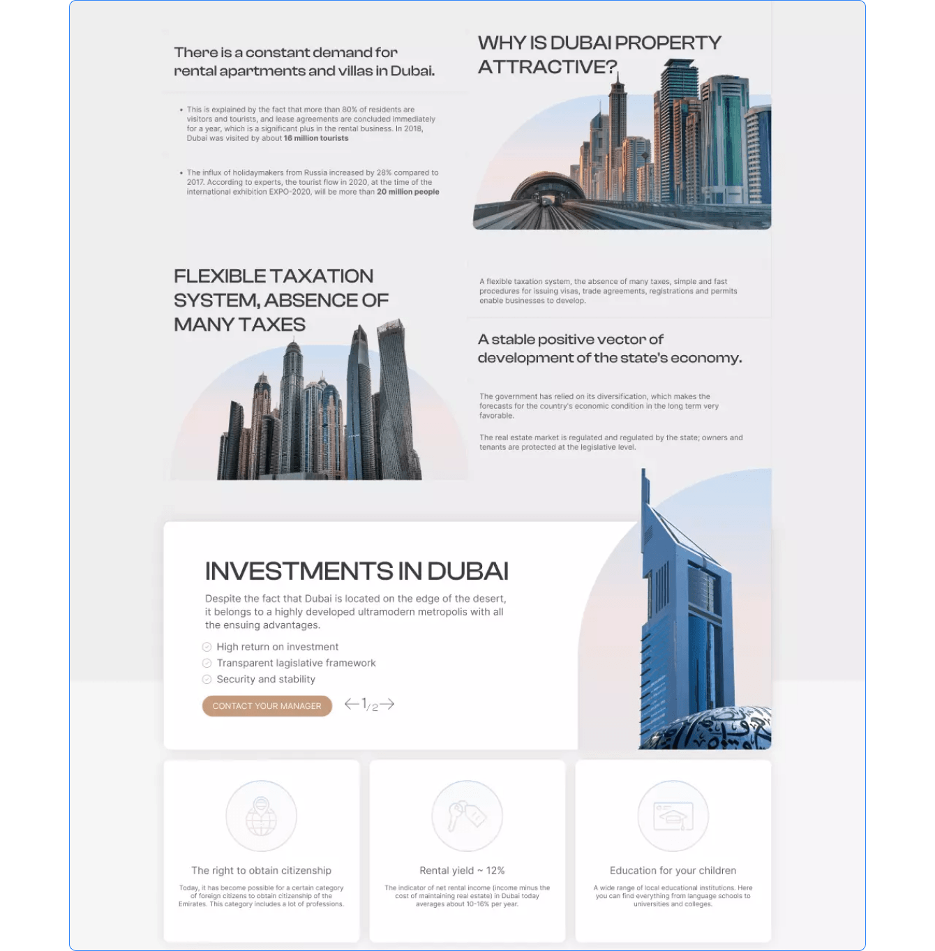 Мы полностью заменили визуал и тексты, чтобы донести преимущества покупки недвижимости в Дубае. Никаких общих фраз и воды, только факты о населении, упрощённом налогообложении, перспективах экономики и получении гражданства.