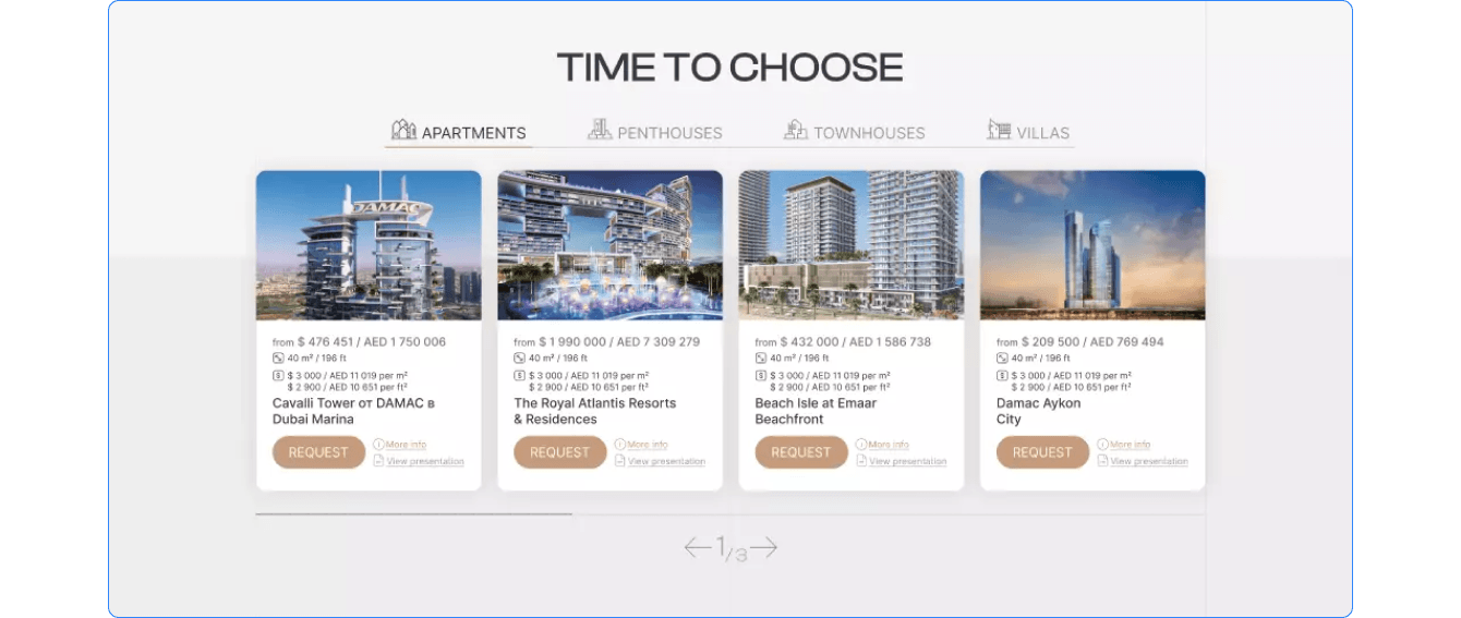 Мы полностью заменили визуал и тексты, чтобы донести преимущества покупки недвижимости в Дубае. Никаких общих фраз и воды, только факты о населении, упрощённом налогообложении, перспективах экономики и получении гражданства.