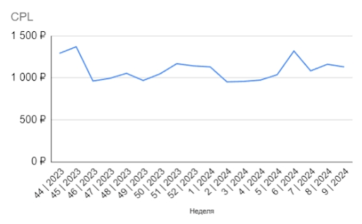 CPL по неделям. На графике видно, что получилось даже снизить цену за отправку формы