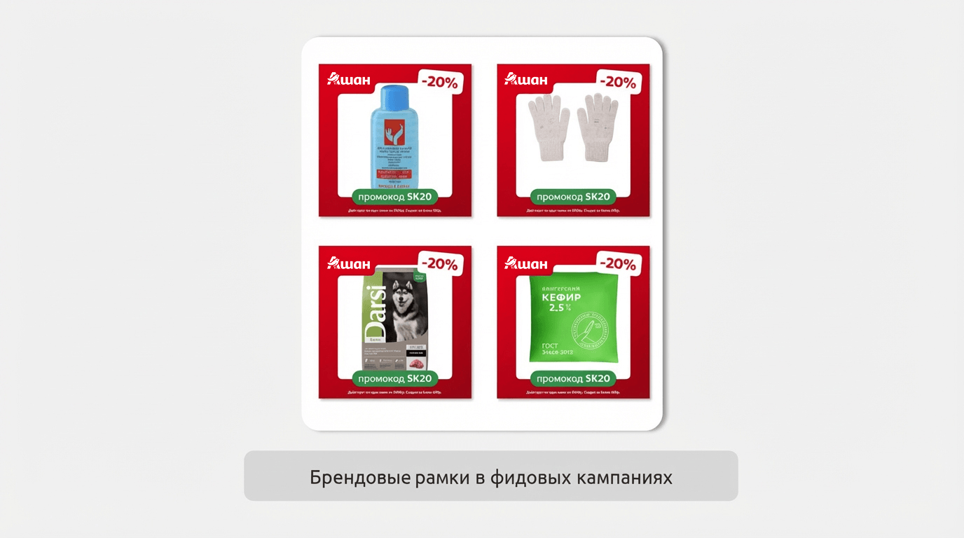 Чтобы бренд выделялся на фоне высокой активности в категории e-grocery, мы наделили performance-кампании дополнительной имиджевой функцией. Одним из ключевых решений стало внедрение брендированных рамок в товарные фиды Яндекса — команда i-Media реализовала это еще до того, как функционал стал общедоступным на платформе. Это обеспечило стабильный визуальный контакт с «Ашан» непосредственно в момент выбора товара и принятия решения о покупке.