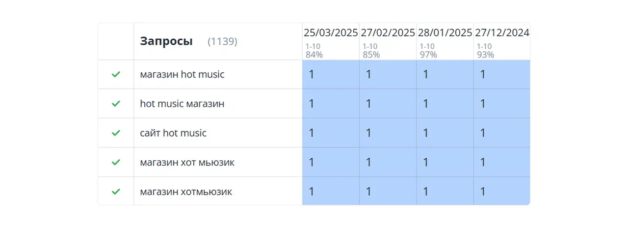 • Мониторинг позиций: Подключили профессиональный сервис для ежедневного отслеживания позиций по всем ключевым запросам, что позволило оперативно реагировать на изменения.