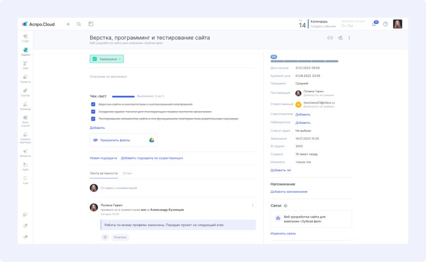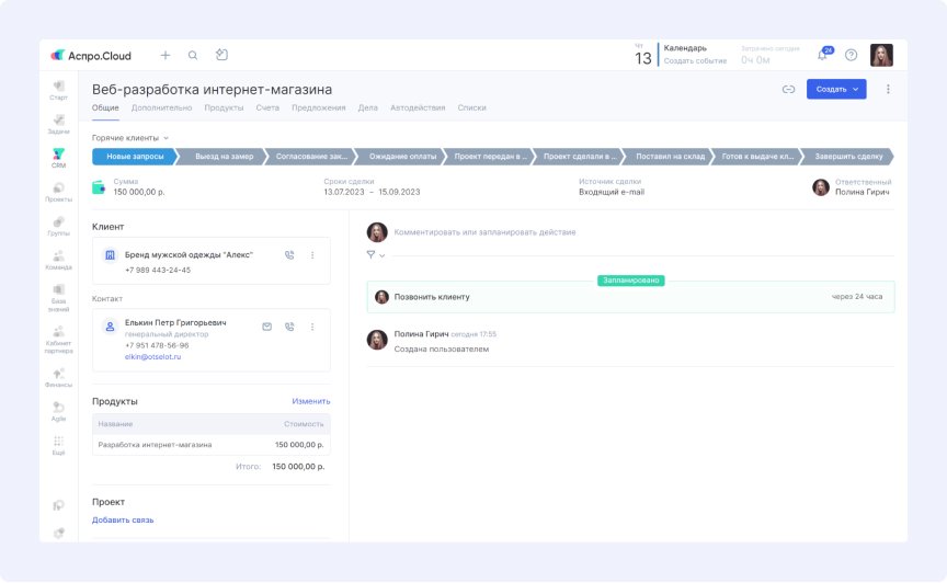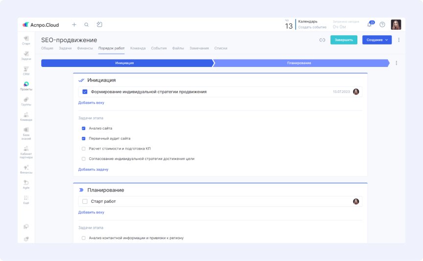 Мы провели комплексное внедрение Аспро.Cloud, охватившее все ключевые бизнес-процессы агентства. Работа велась по трем основным направлениям: управление проектами, автоматизация продаж и финансовый учет.