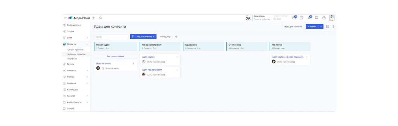 Создали систему шаблонов проектов для каждого этапа производства. Разработали специальный шаблон "Идея" для оценки и отбора креативных концепций.