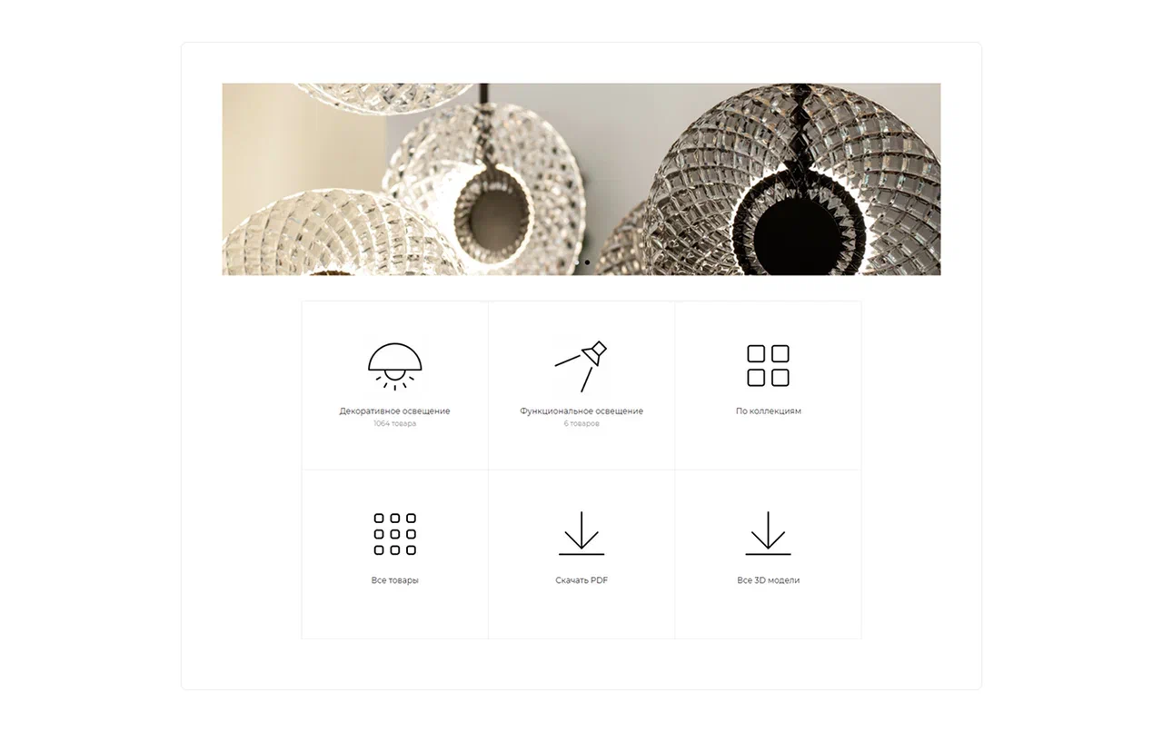 • Полезный контент для покупателей: Над категориями разместили баннер, откуда клиенты могут скачать полный каталог в PDF или получить доступ к 3D-моделям товаров. Это добавило сайту ценности для профессиональных дизайнеров и архитекторов.
