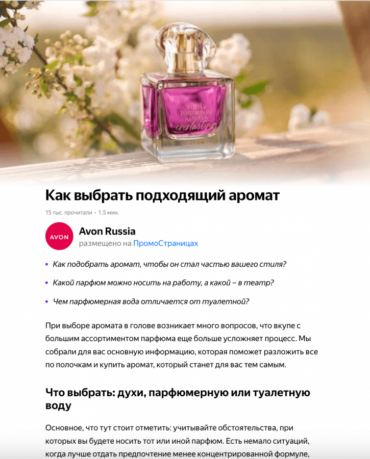 Логика была следующая: в бьюти-категории пользователь часто не знает, какой продукт ему подойдет. Если помочь с выбором, то барьер снижается, а покупка как раз может произойти позже. Поэтому статья работала как гид и помощник, а не как коммерческая витрина: объясняла различия ароматов, помогала определить предпочтения, давала рекомендации.